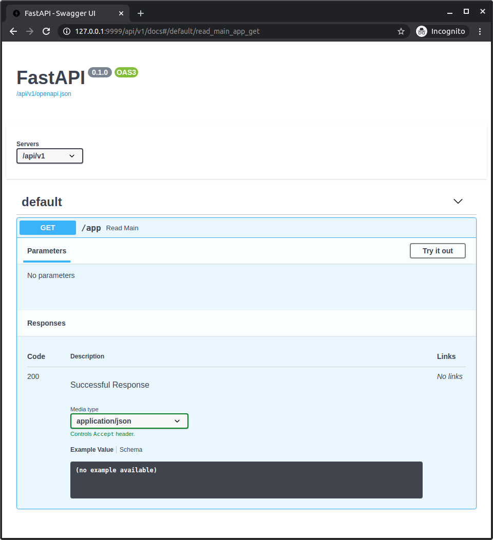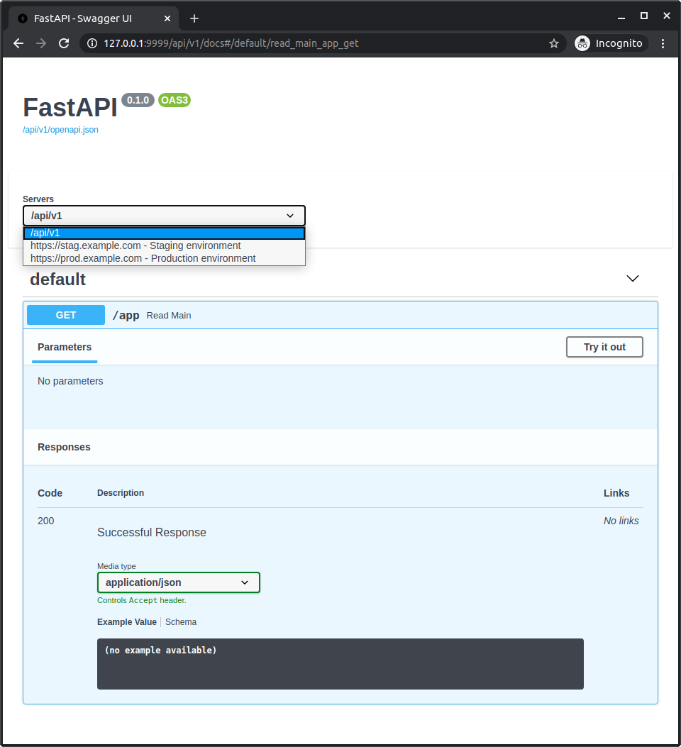 Notice that even though you are accessing it at http://127.0.0.1:8000/app it shows the root_path of /api/v1, taken from the option --root-path.